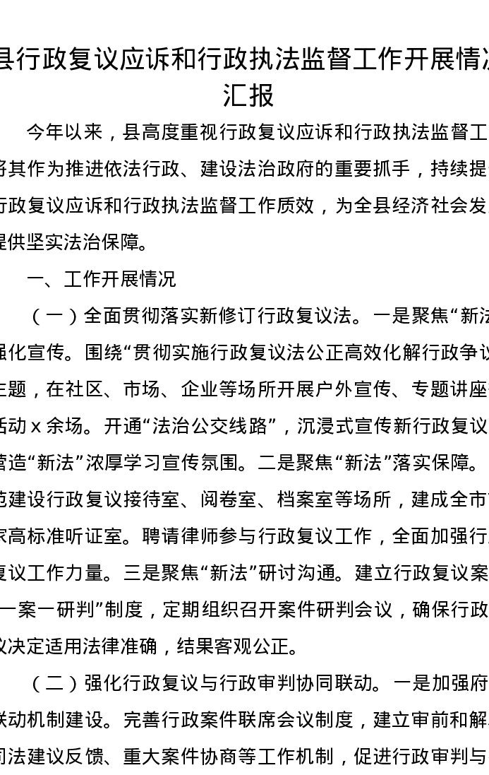 县行政复议应诉和行政执法监督工作开展情况汇报