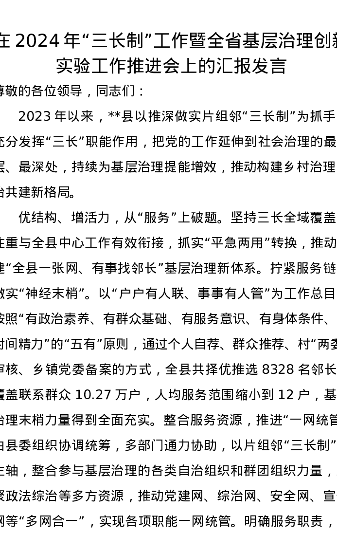 在2024年“三长制”工作暨全省基层治理创新实验工作推进会上的汇报发言