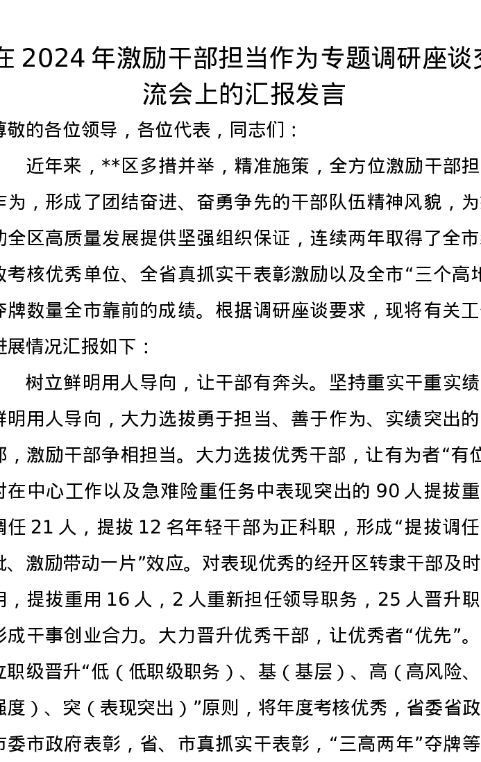 在2024年激励干部担当作为专题调研座谈交流会上的汇报发言