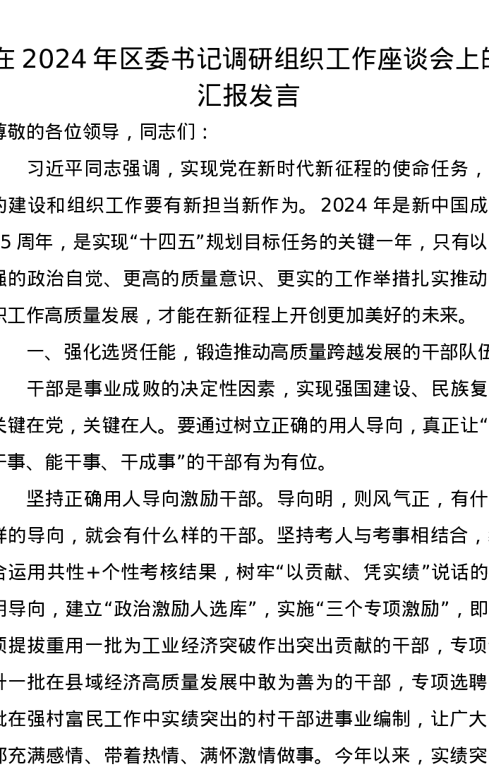 在2024年区委书记调研组织工作座谈会上的汇报发言