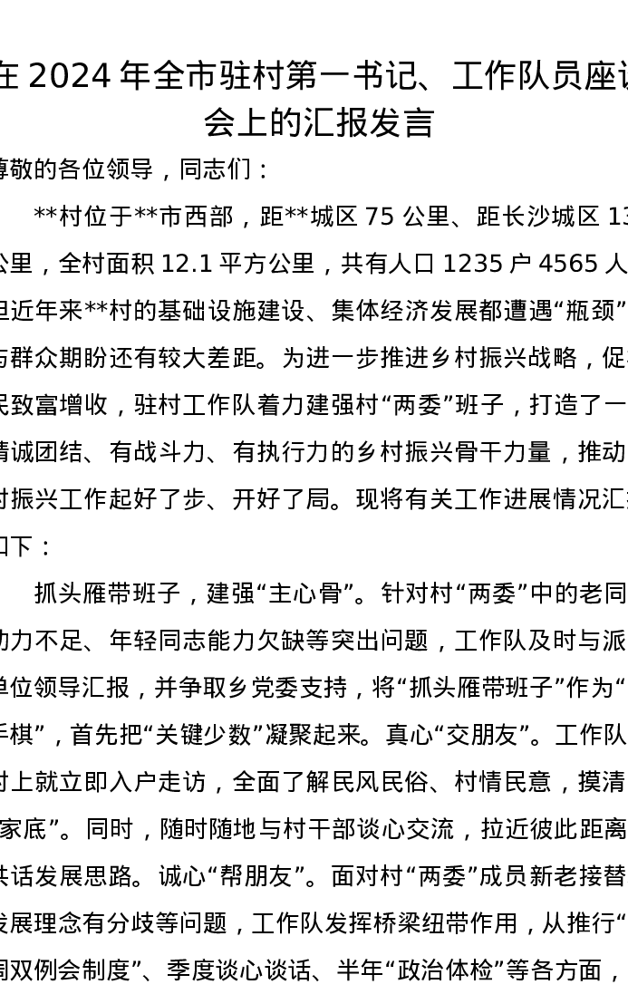 在2024年全市驻村第一书记、工作队员座谈会上的汇报发言