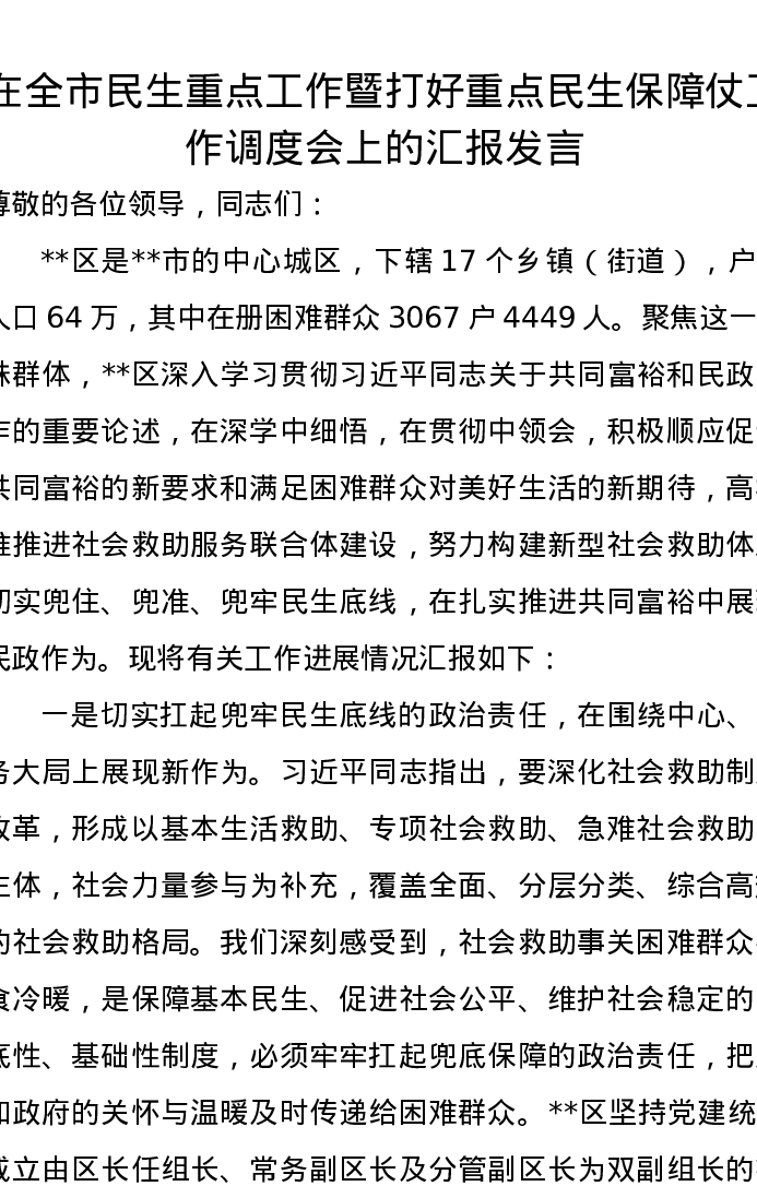 在全市民生重点工作暨打好重点民生保障仗工作调度会上的汇报发言