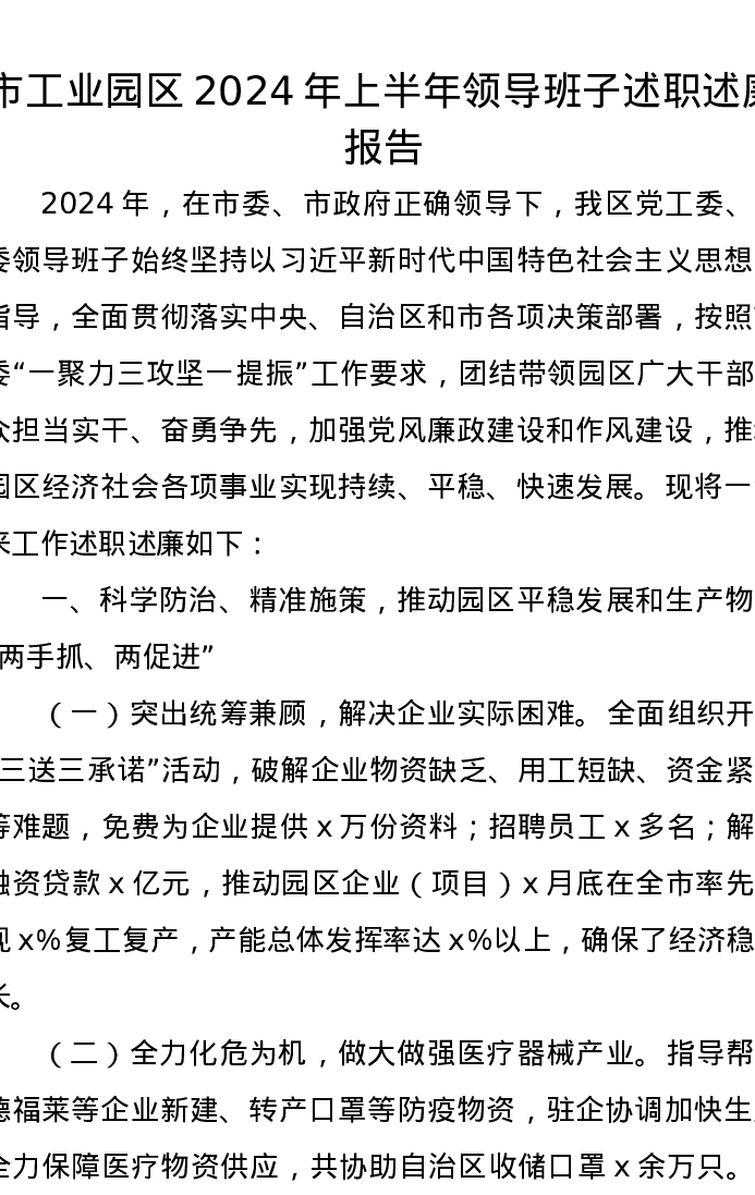 市工业园区2024年上半年领导班子述职述廉报告