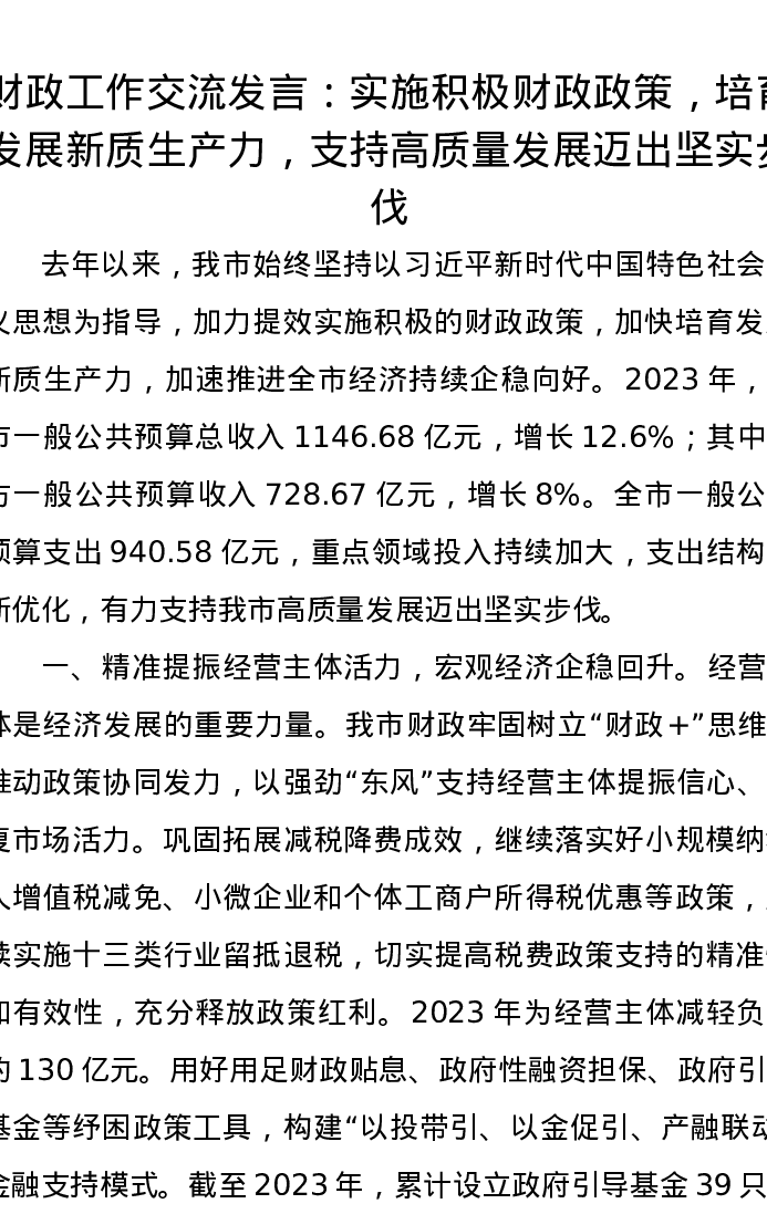 财政工作交流发言:实施积极财政政策,培育发展新质生产力,支持高质量发展迈出坚实步伐