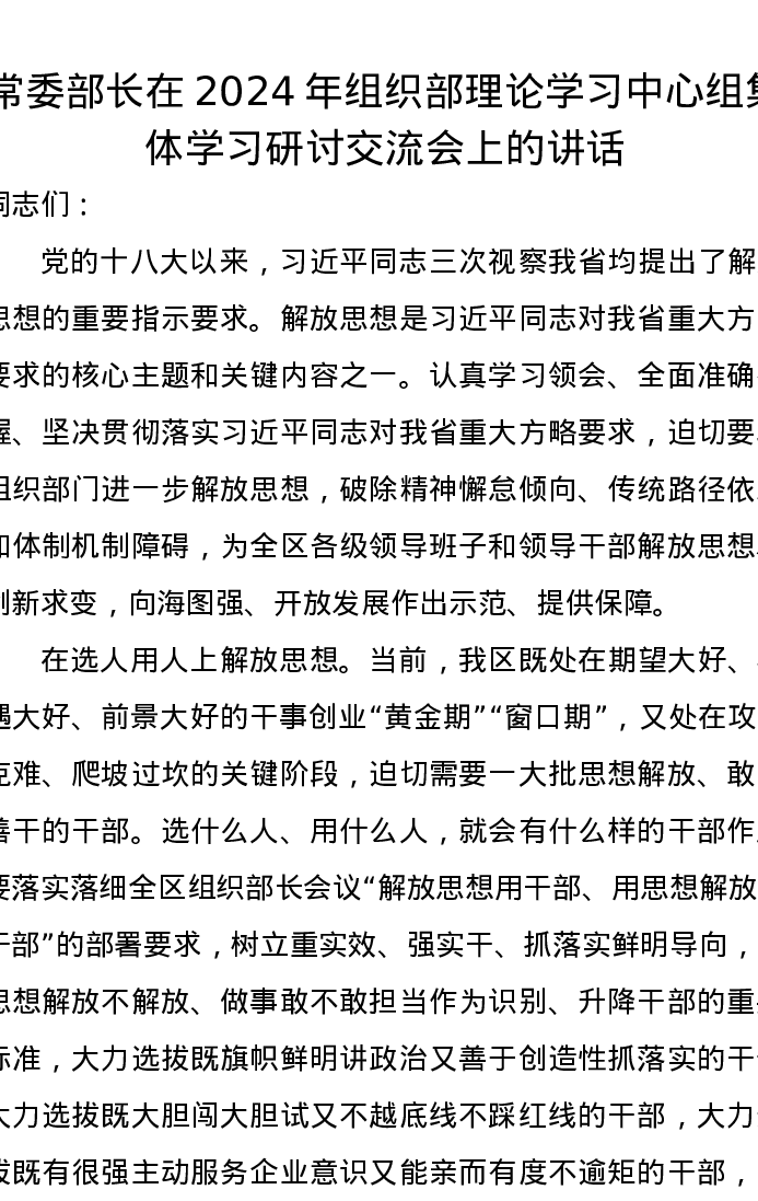 常委部长在2024年组织部理论学习中心组集体学习研讨交流会上的讲话