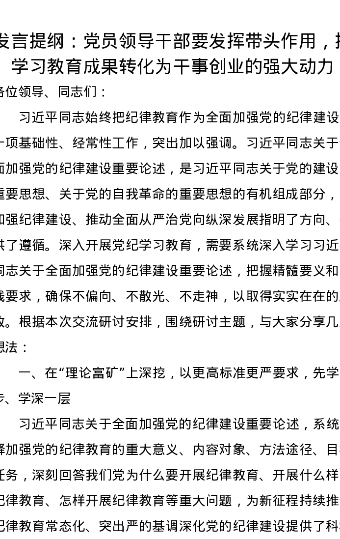 发言提纲:党员领导干部要发挥带头作用,把学习教育成果转化为干事创业的强大动力