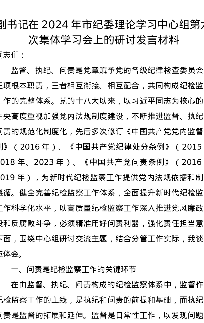 副书记在2024年市纪委理论学习中心组第六次集体学习会上的研讨发言材料