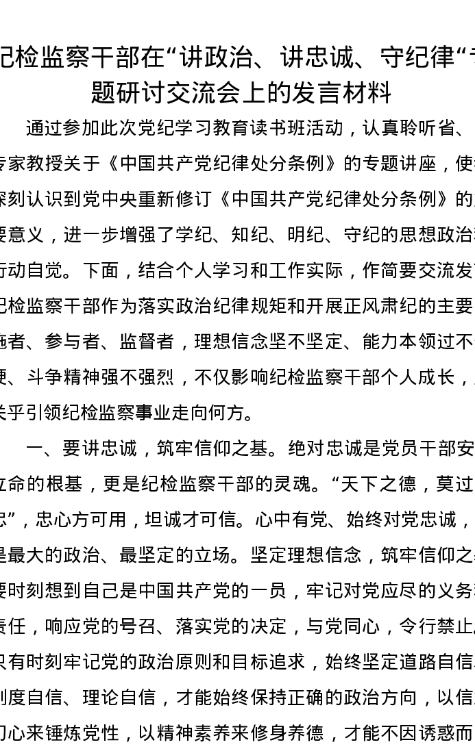纪检监察干部在“讲政治、讲忠诚、守纪律“专题研讨交流会上的发言材料