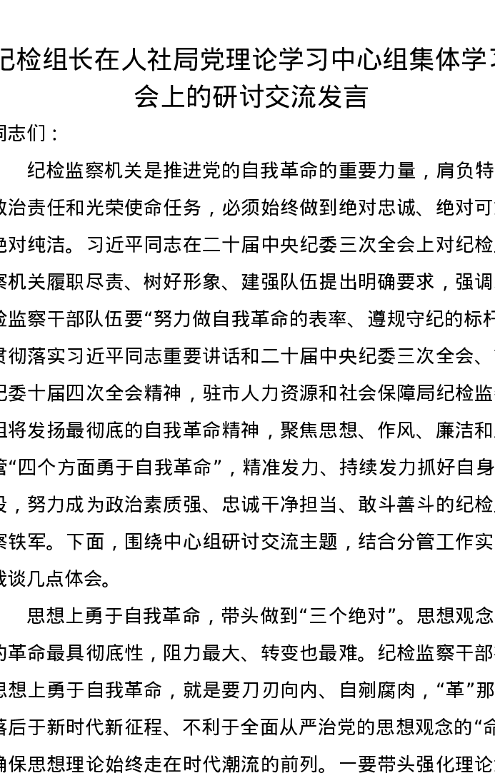 纪检组长在人社局党理论学习中心组集体学习会上的研讨交流发言