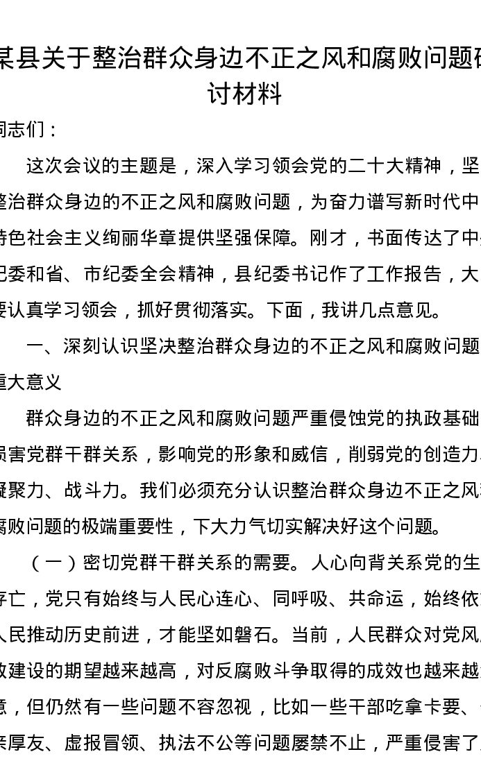 某县关于整治群众身边不正之风和腐败问题研讨材料