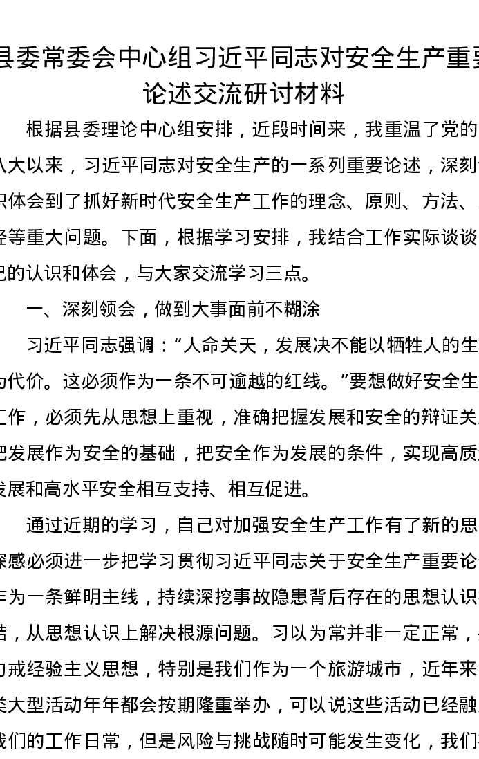 县委常委会中心组习近平总书记对安全生产重要论述交流研讨发言材料