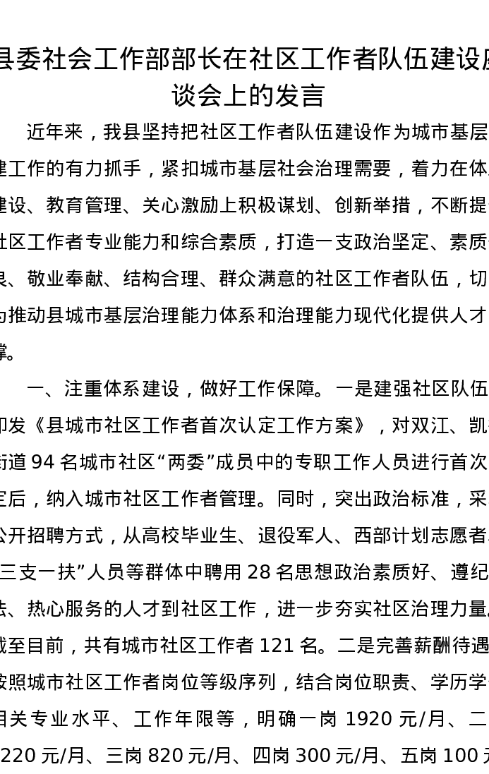 县委社会工作部部长在社区工作者队伍建设座谈会上的发言