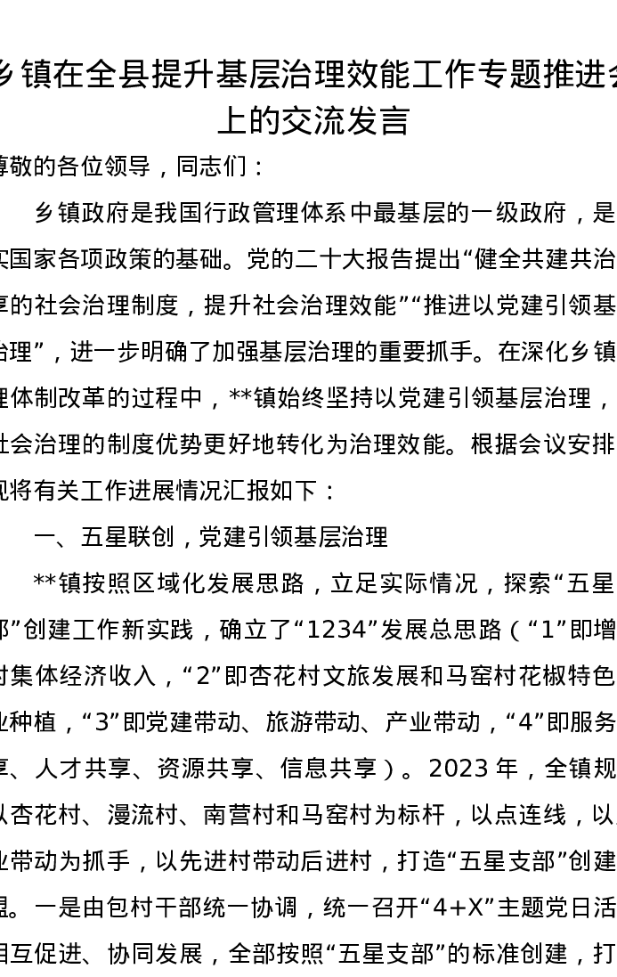 乡镇在全县提升基层治理效能工作专题推进会上的交流发言