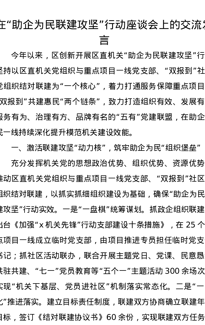 在“助企为民联建攻坚”行动座谈会上的交流发言
