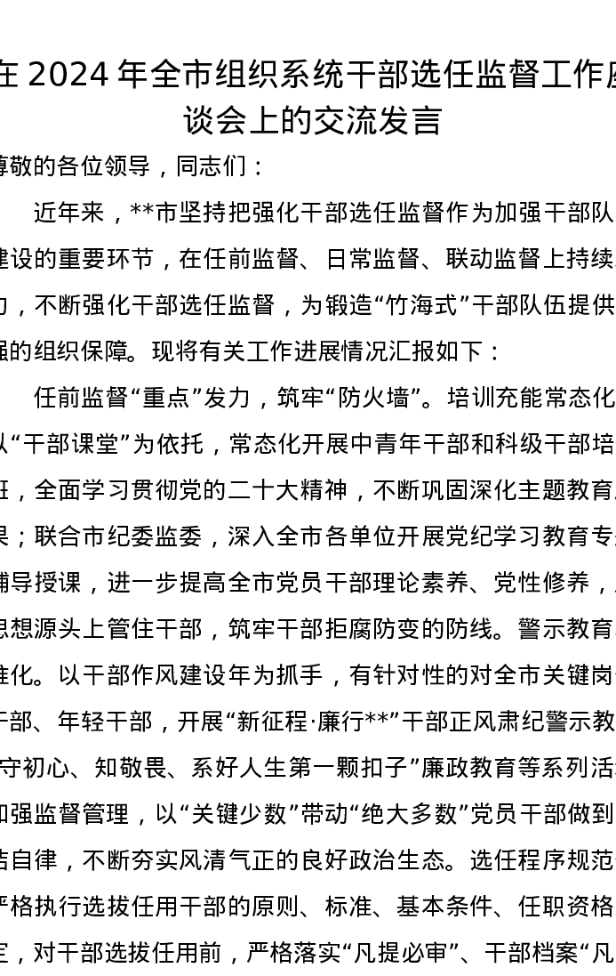 在2024年全市组织系统干部选任监督工作座谈会上的交流发言