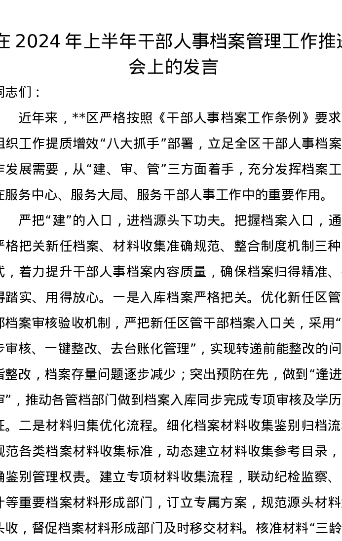 在2024年上半年干部人事档案管理工作推进会上的发言