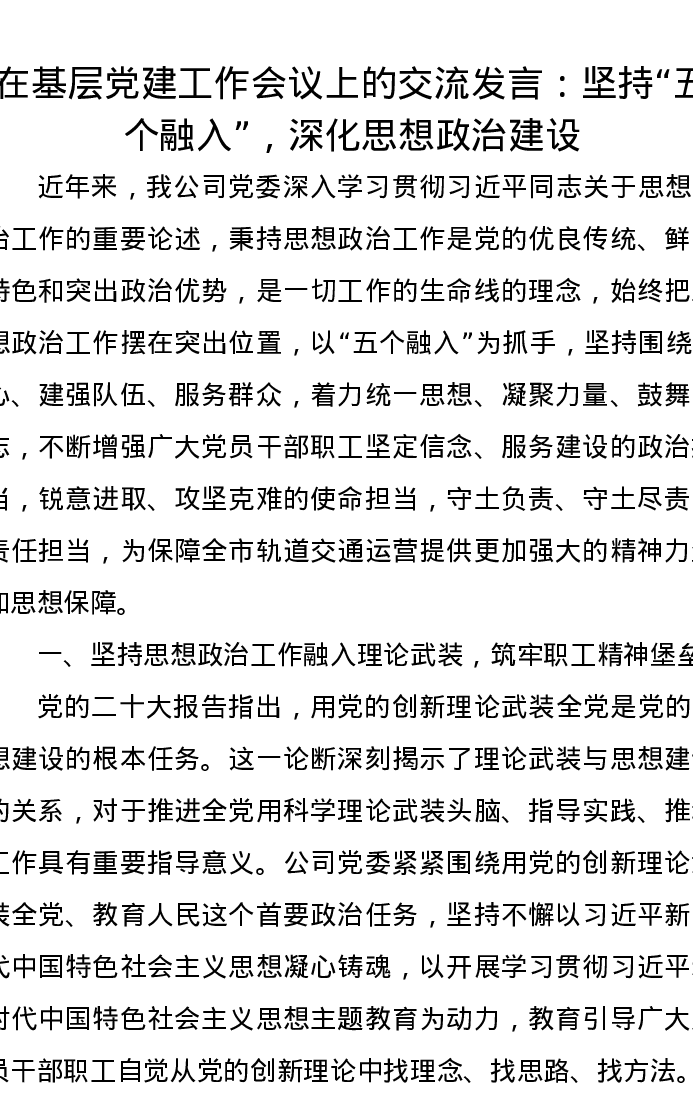 在基层党建工作会议上的交流发言:坚持“五个融入”,深化思想政治建设