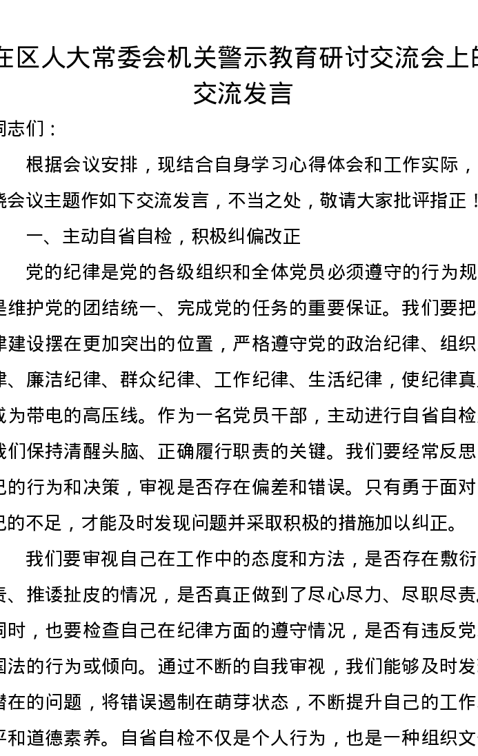 在区人大常委会机关警示教育研讨交流会上的交流发言