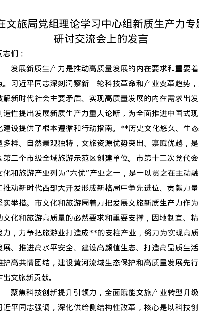 在文旅局党组理论学习中心组新质生产力专题研讨交流会上的发言