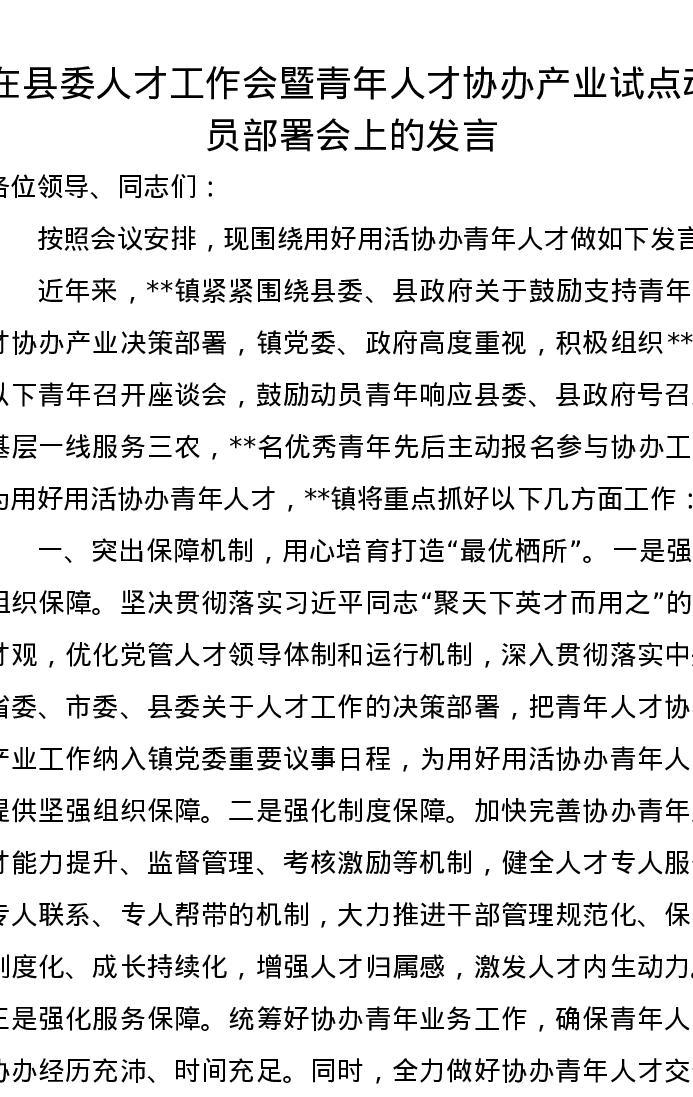 在县委人才工作会暨青年人才协办产业试点动员部署会上的发言