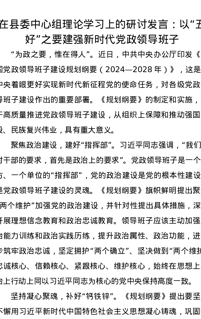 在县委中心组理论学习上的研讨发言:以“五好”之要建强新时代党政领导班子