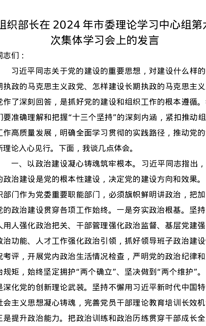 组织部长在2024年市委理论学习中心组第六次集体学习会上的发言