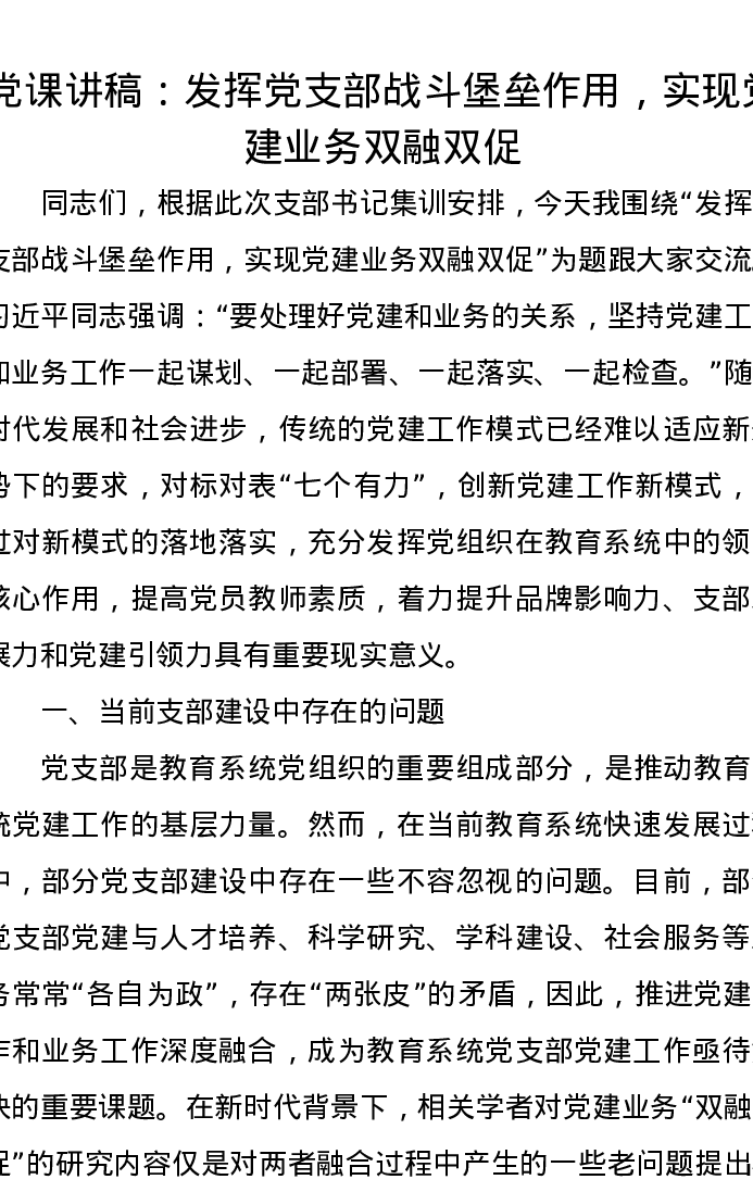 党课讲稿:发挥党支部战斗堡垒作用,实现党建业务双融双促