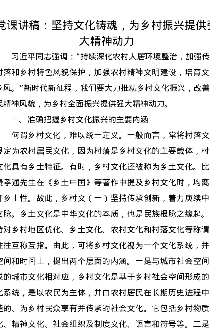 党课讲稿:坚持文化铸魂,为乡村振兴提供强大精神动力