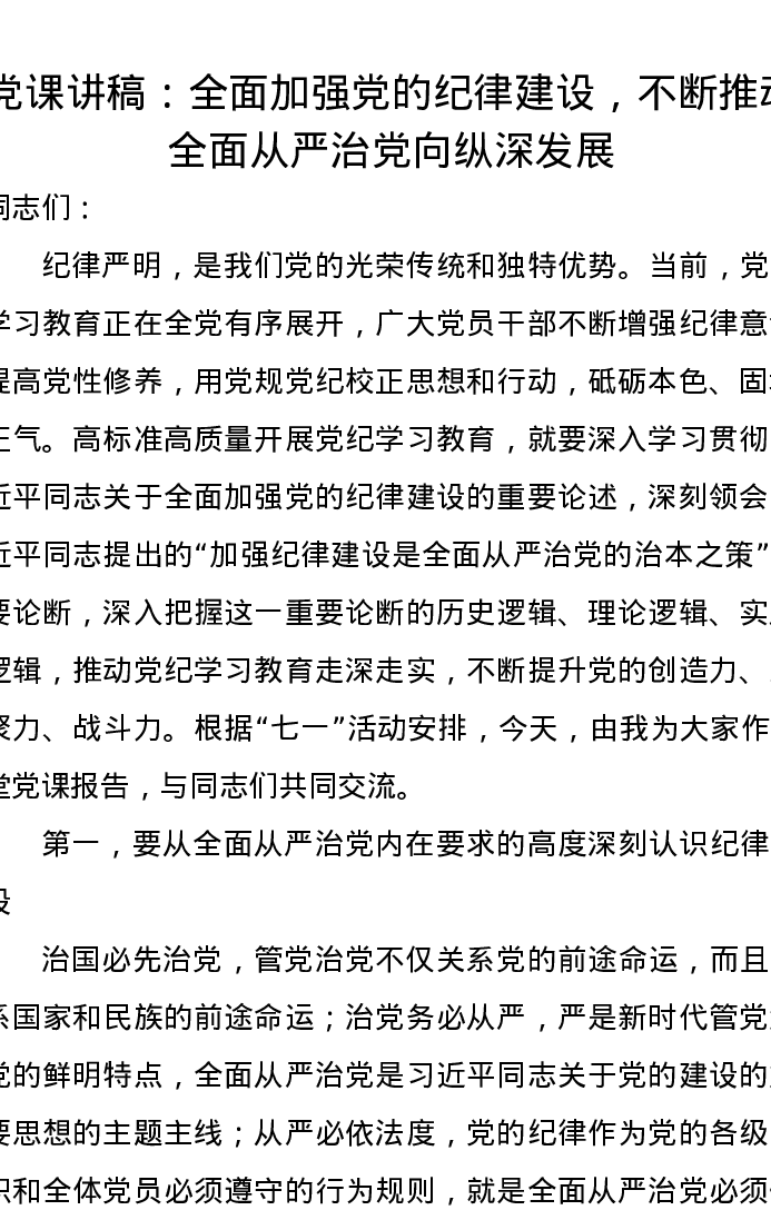 党课讲稿:全面加强党的纪律建设,不断推动全面从严治党向纵深发展