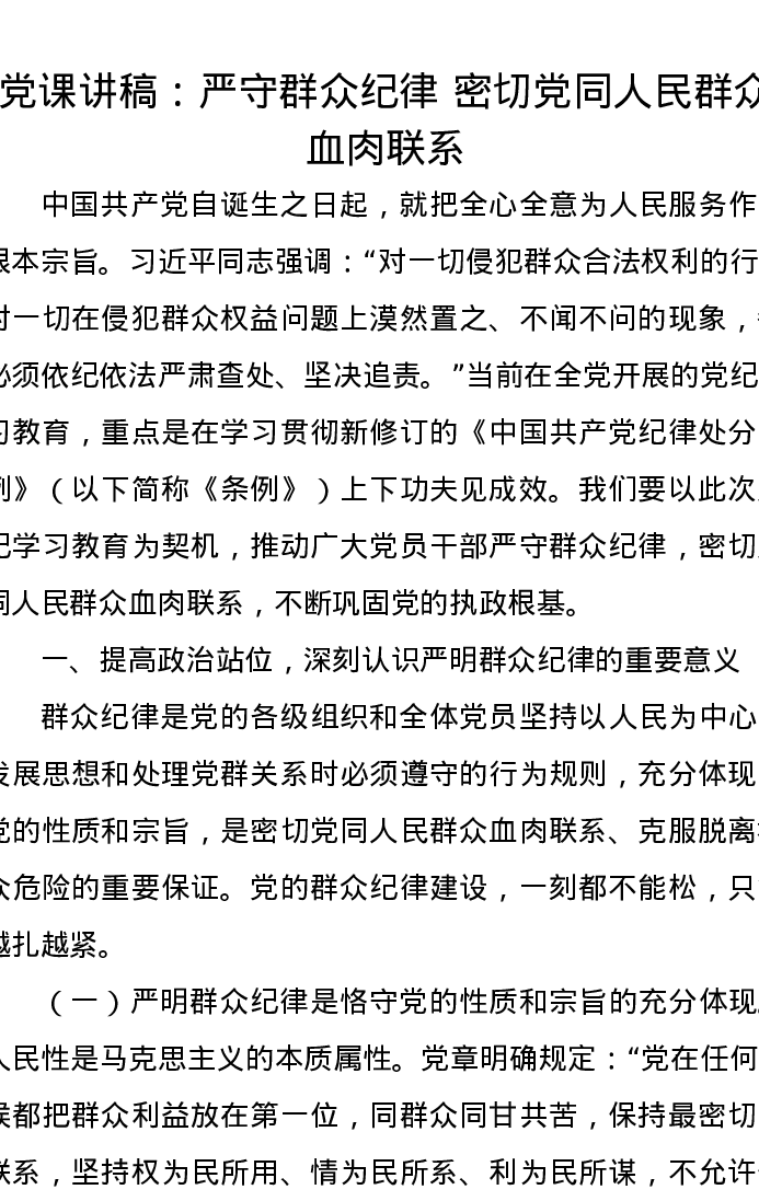 党课讲稿:严守群众纪律,密切党同人民群众血肉联系