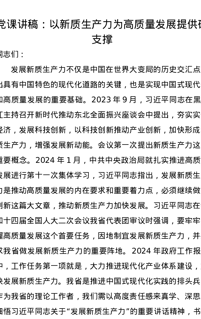 党课讲稿:以新质生产力为高质量发展提供硬支撑