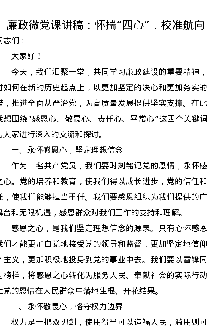 廉政微党课讲稿:怀揣“四心”,校准航向