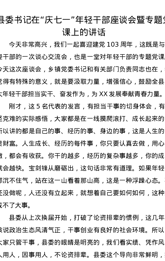 县委书记在“庆七一”年轻干部座谈会暨专题党课上的讲话