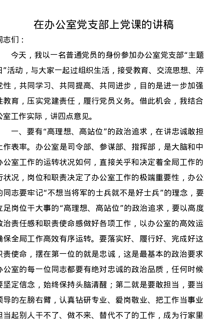 在办公室党支部上党课的讲稿