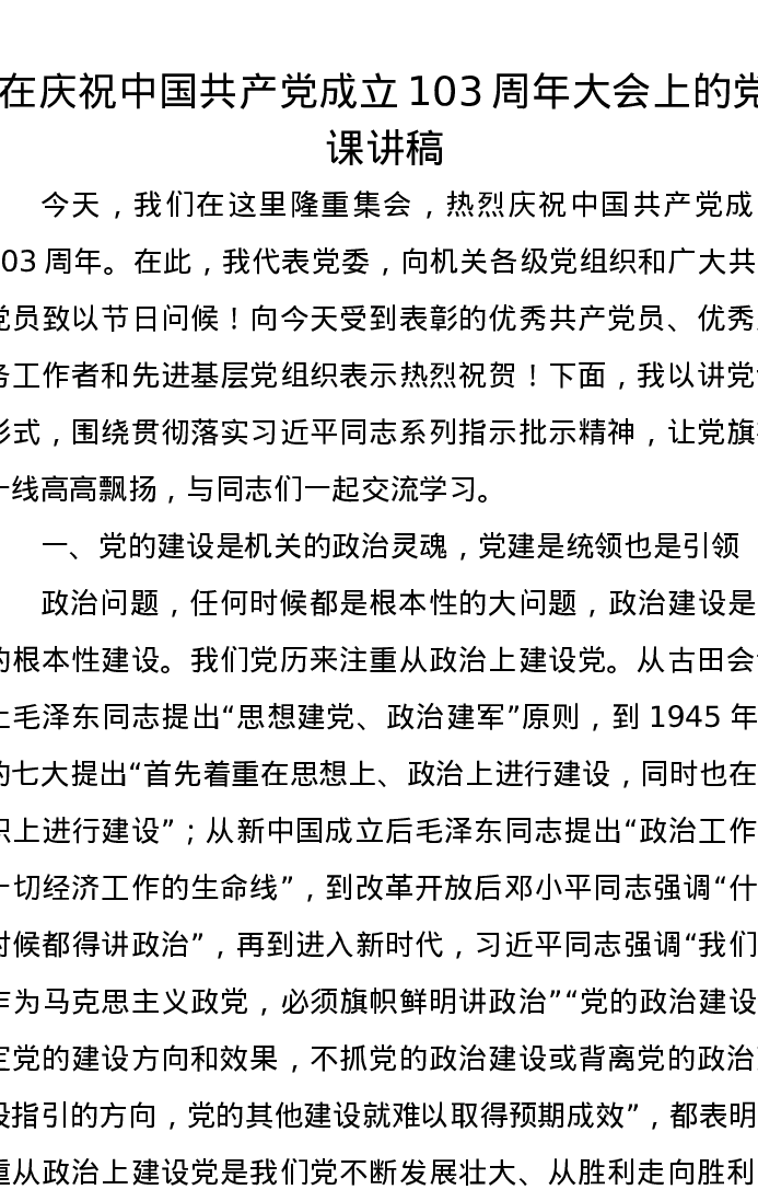 在庆祝中国共产党成立103周年大会上的党课讲稿