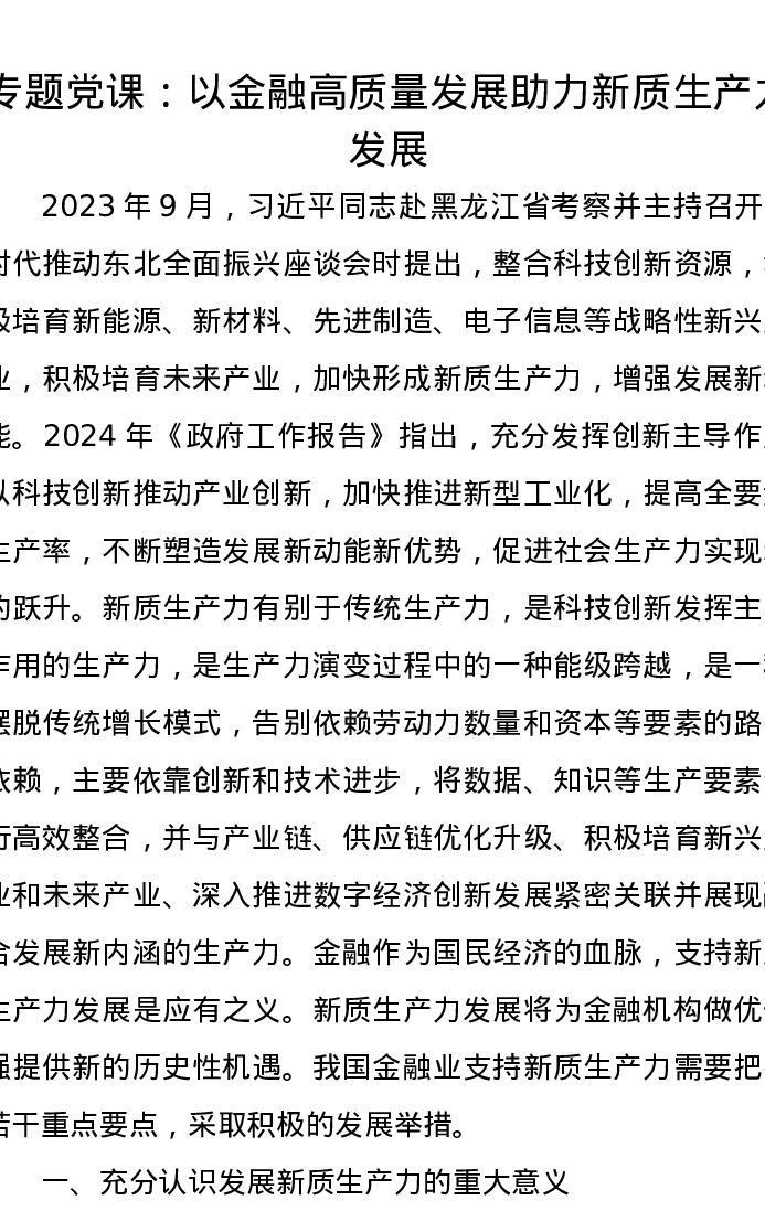 专题党课:以金融高质量发展助力新质生产力发展