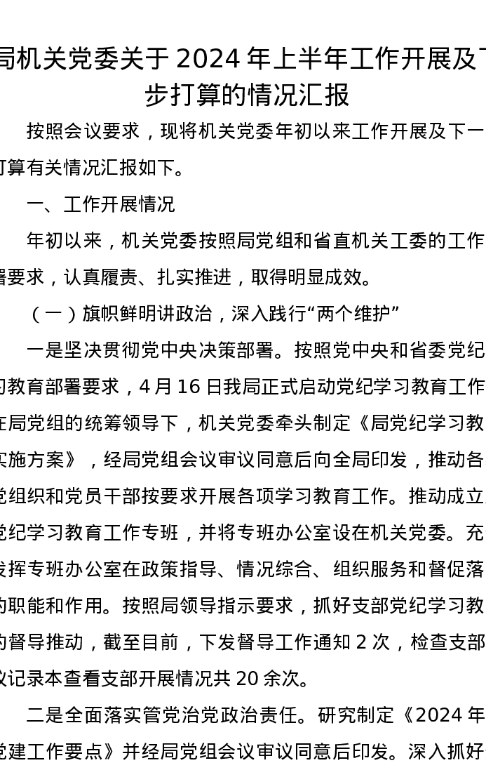 局机关党委关于2024年上半年工作开展及下步打算的情况汇报