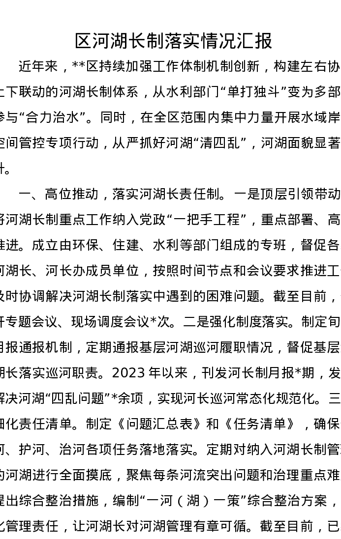 区河湖长制落实情况汇报