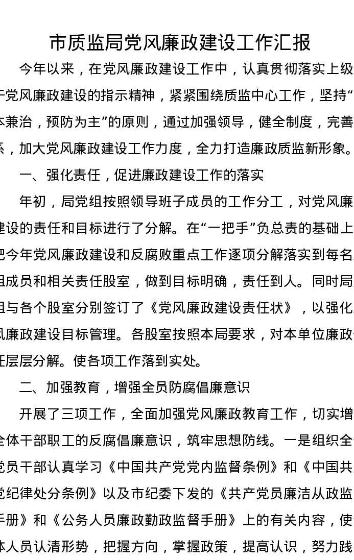 市质监局党风廉政建设工作汇报