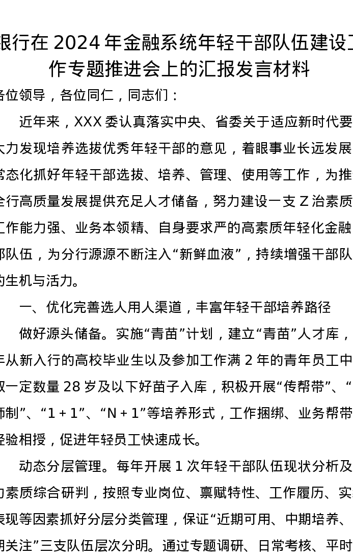 银行在2024年金融系统年轻干部队伍建设工作专题推进会上的汇报发言材料