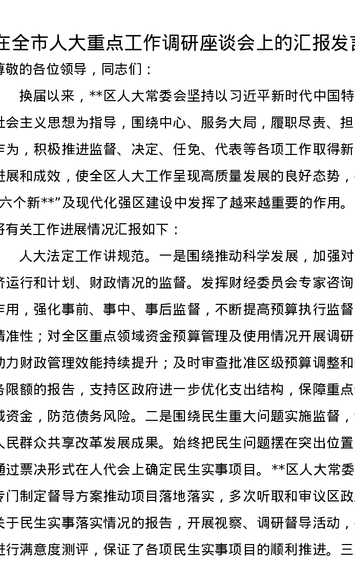 在全市人大重点工作调研座谈会上的汇报发言