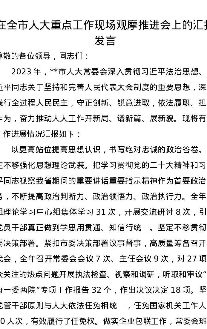 在全市人大重点工作现场观摩推进会上的汇报发言