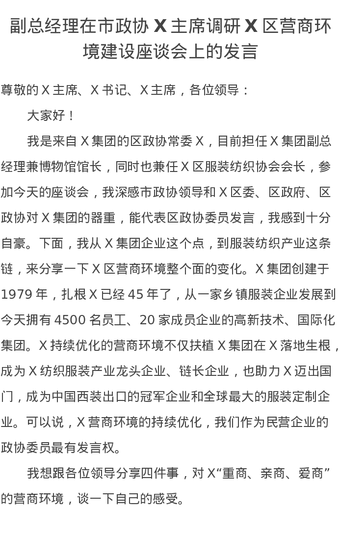 副总经理在市政协X主席调研X区营商环境建设座谈会上的发言
