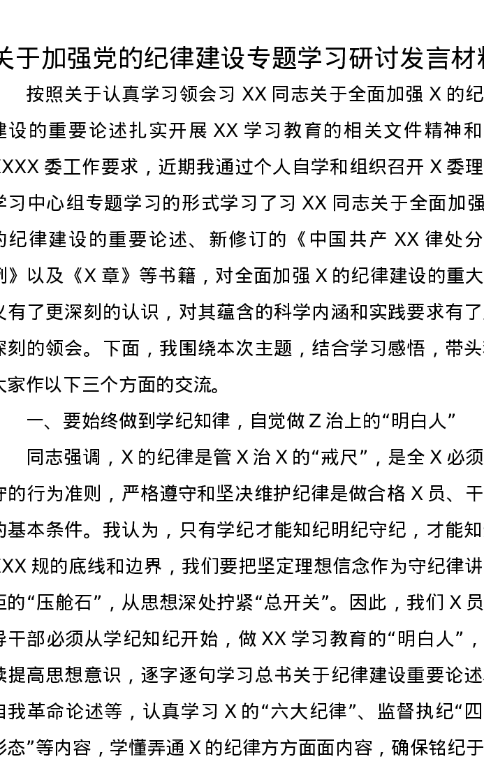 关于加强党的纪律建设专题学习研讨发言材料