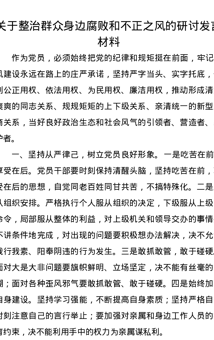 关于整治群众身边腐败和不正之风的研讨发言材料