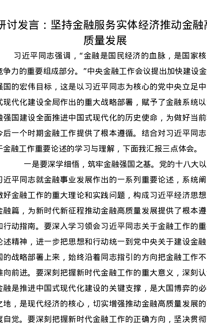 研讨发言:坚持金融服务实体经济推动金融高质量发展