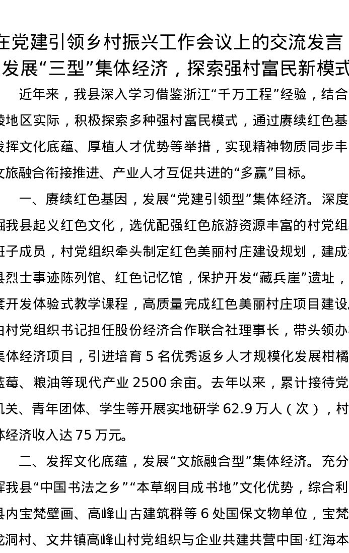在党建引领乡村振兴工作会议上的交流发言:发展“三型”集体经济,探索强村富民新模式