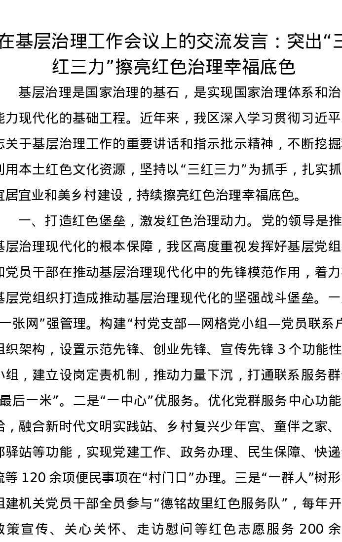 在基层治理工作会议上的交流发言:突出“三红三力”擦亮红色治理幸福底色
