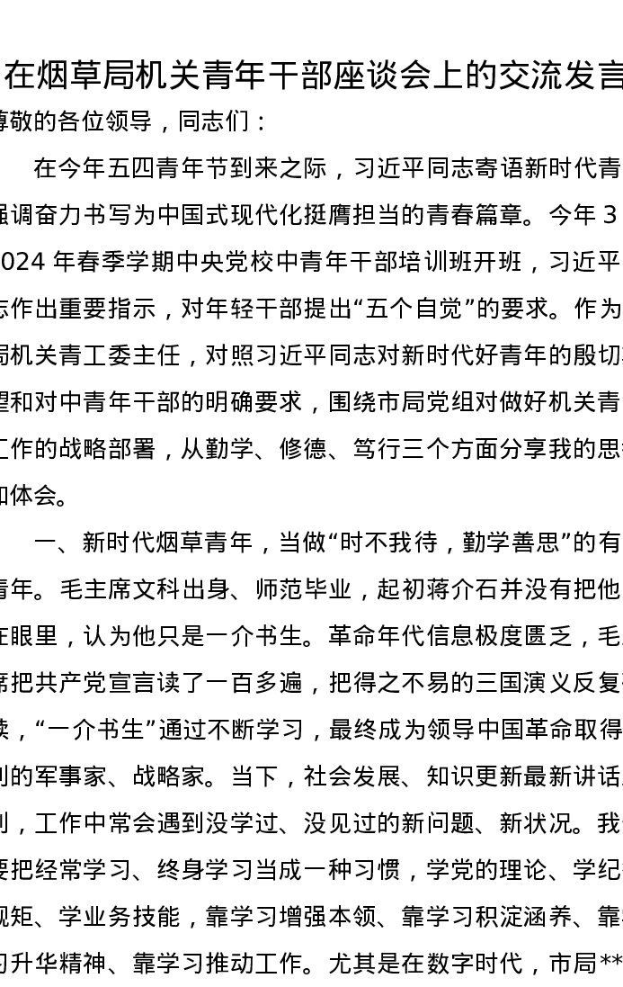 在烟草局机关青年干部座谈会上的交流发言