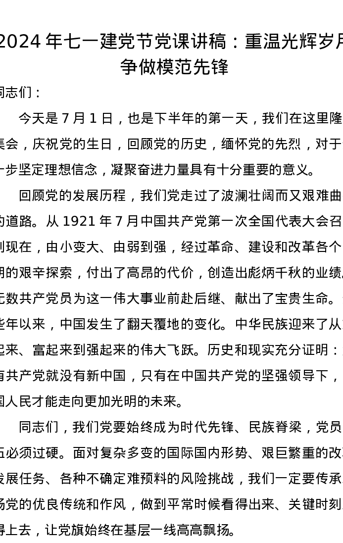 2024年七一建党节党课讲稿:重温光辉岁月,争做模范先锋